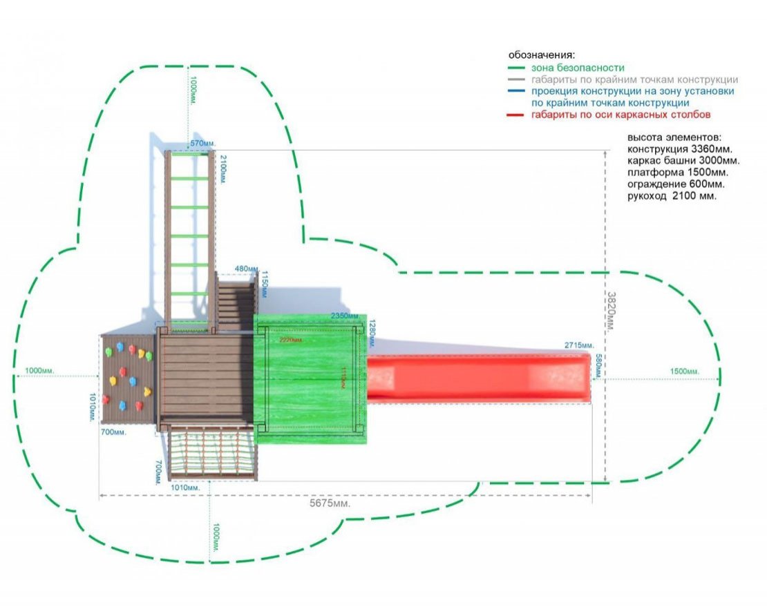 Для безопасной эксплуатации конструкции, площадка должна быть свободна от зеленых насаждений, сооружений и других конструкций, ровная, без перепадов уровня, без впадин и насыпей. Габариты площадки с учетом зоны безопасности длина 8175мм. ширина 5920мм., площадь площадки S-48,4м². Запрещено устанавливать конструкцию в зонах с повышенным риском провалов в грунте (болотистая местность, береговая линия водоемов, в непосредственной близости с оврагами и обрывами).