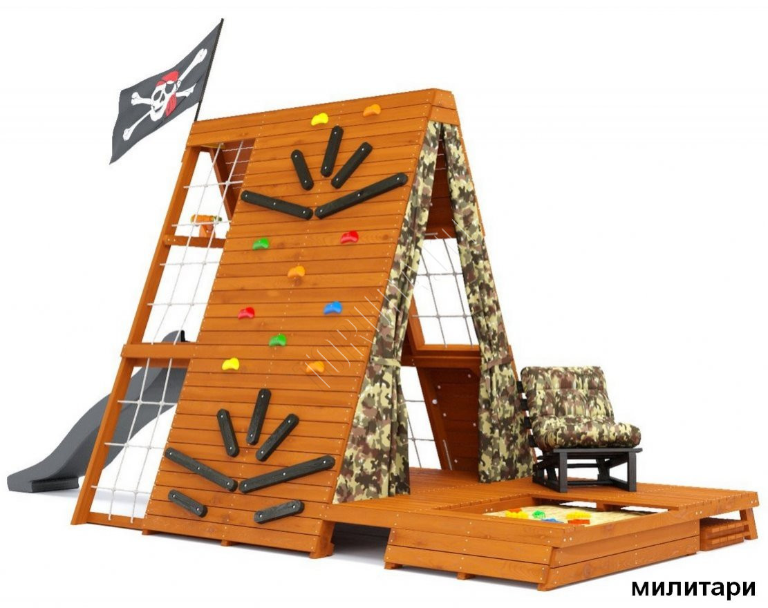 - Спортивный домик выполнен из экологически чистых материалов из массива дерева, а краска на водной основе имеет разрешающие сертификаты.