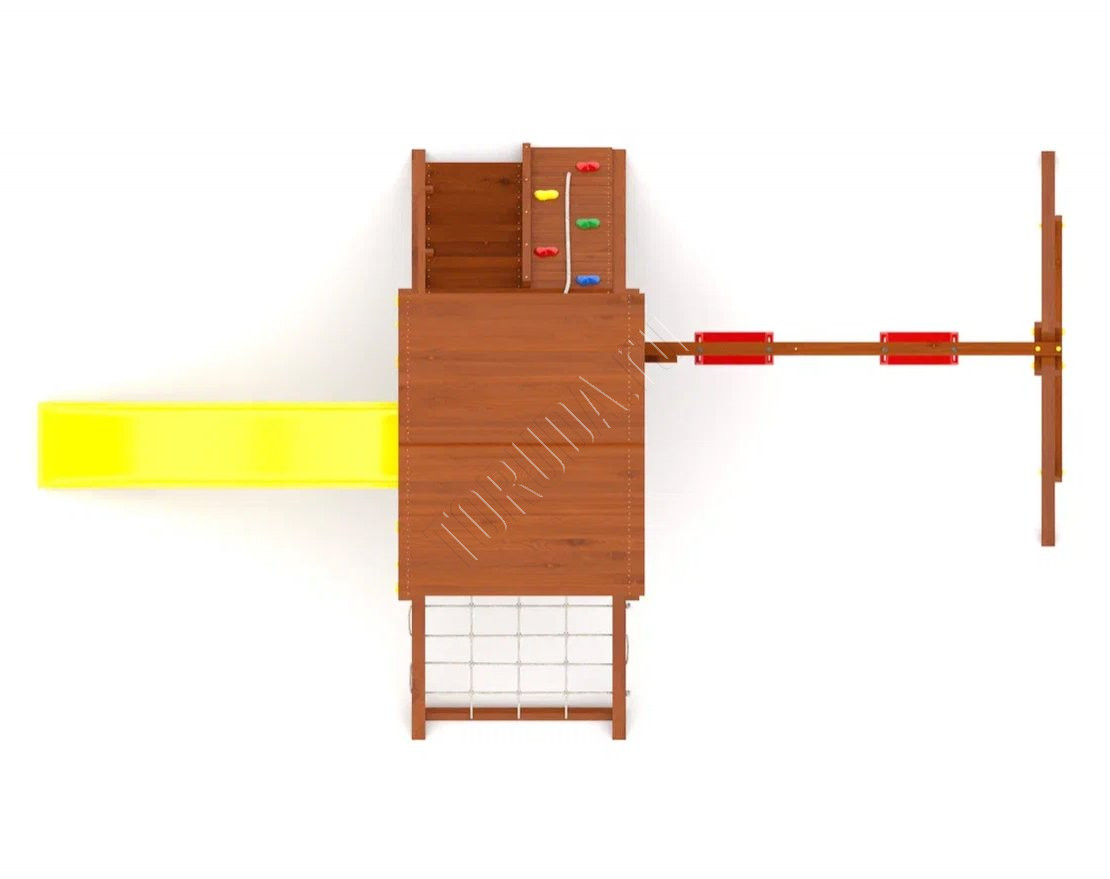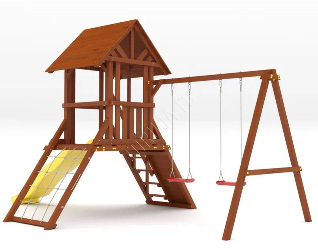Конструкция выполнена из прочного клееного бруса, соответствующего стандартам ГОСТ. Все углы закруглены, а крепёжные элементы скрыты под пластиковыми заглушками, что снижает риск травм и делает площадку безопасной для детей.