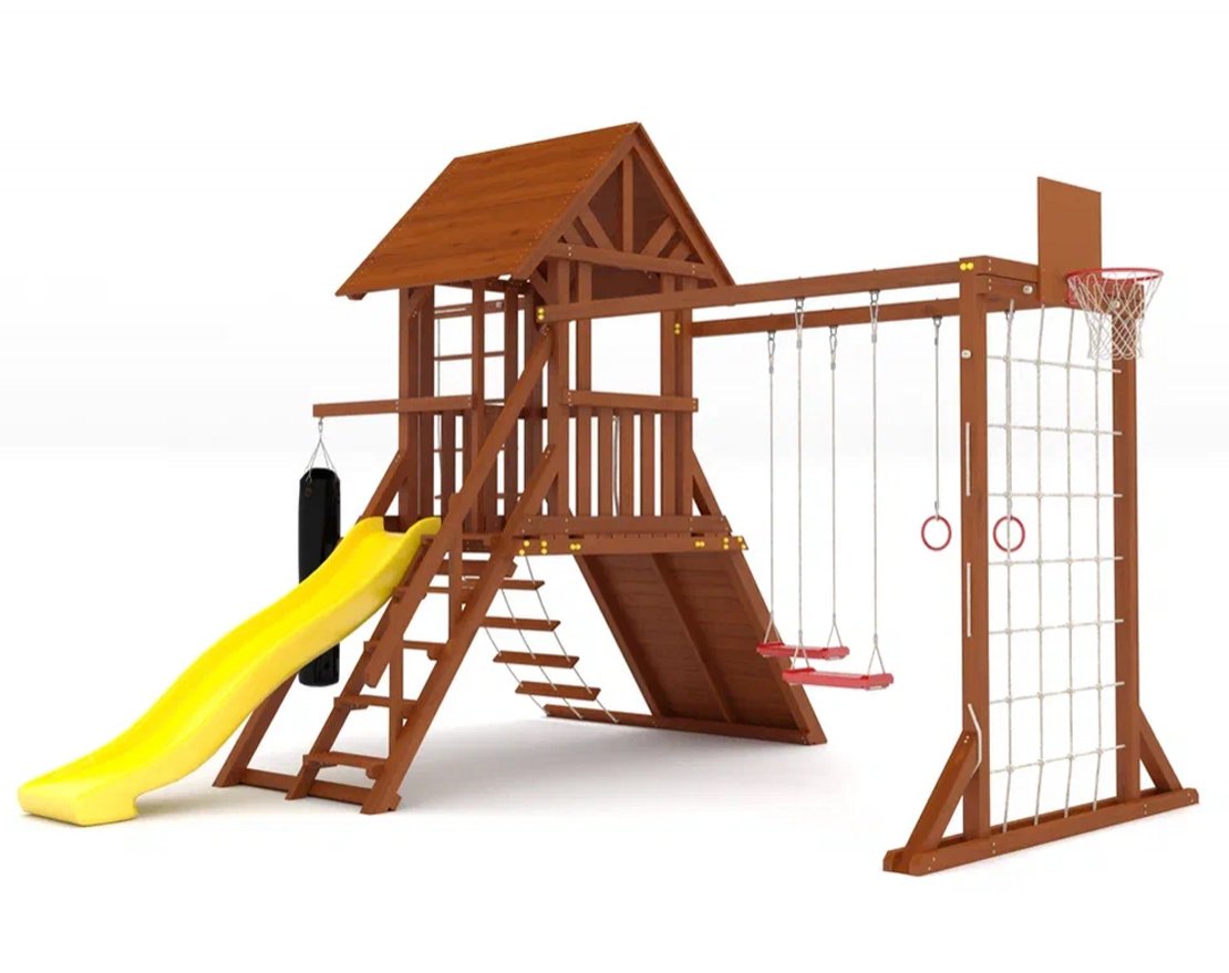 Продуманное игровое пространство, которое сочетает активные развлечения и спортивные элементы. Подходит для детей разного возраста и станет отличным решением для дачного участка или загородного дома.