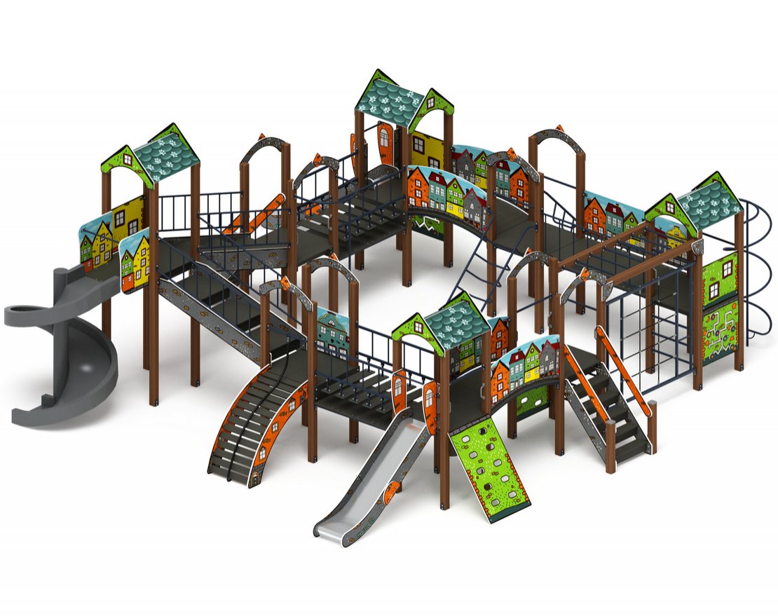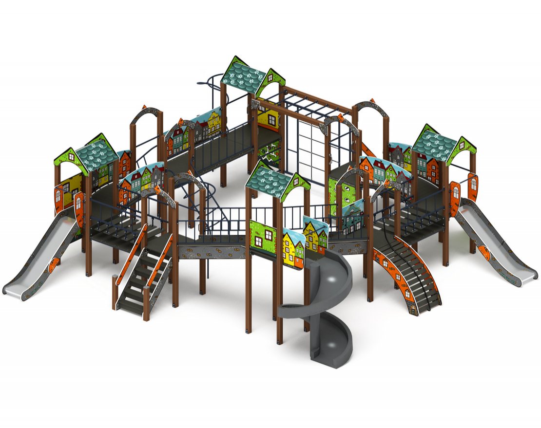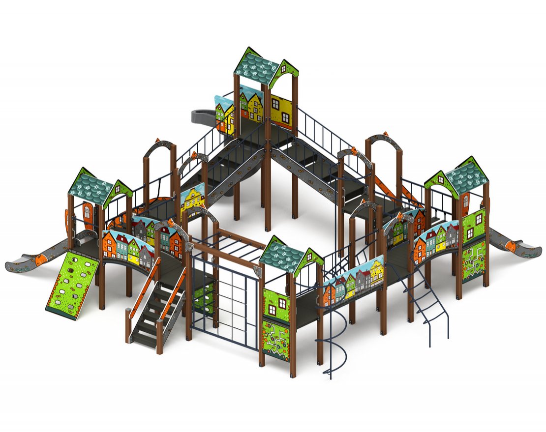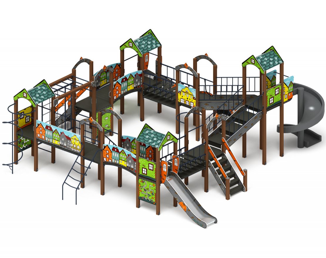 • Особенности комплектации: канат, рукоход, гладиаторская сетка, горка, скалодром, лестница, винтовая горка, спираль, лаз, мост, игровая панель, лаз-дуга, скалолаз