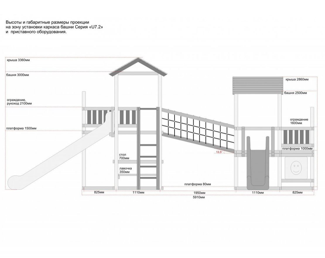 Рекомендованная распределенная единовременная нагрузка: игровая платформа 350кг., канатный мост 150кг., деревянная лестница 100кг., скалодром 150кг., канатная лестница 150кг., рукоход 150кг, столик с лавочками 200кг., скат 150кг.