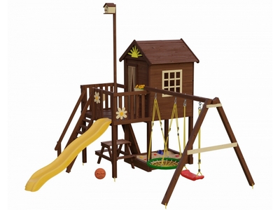 Отличительной особенностью игровых домиков серии Индиана является фирменный элемент "солнышко" на крыше, декоративные ромашки, а также наличие скворечника, возвышающегося над всей конструкцией.