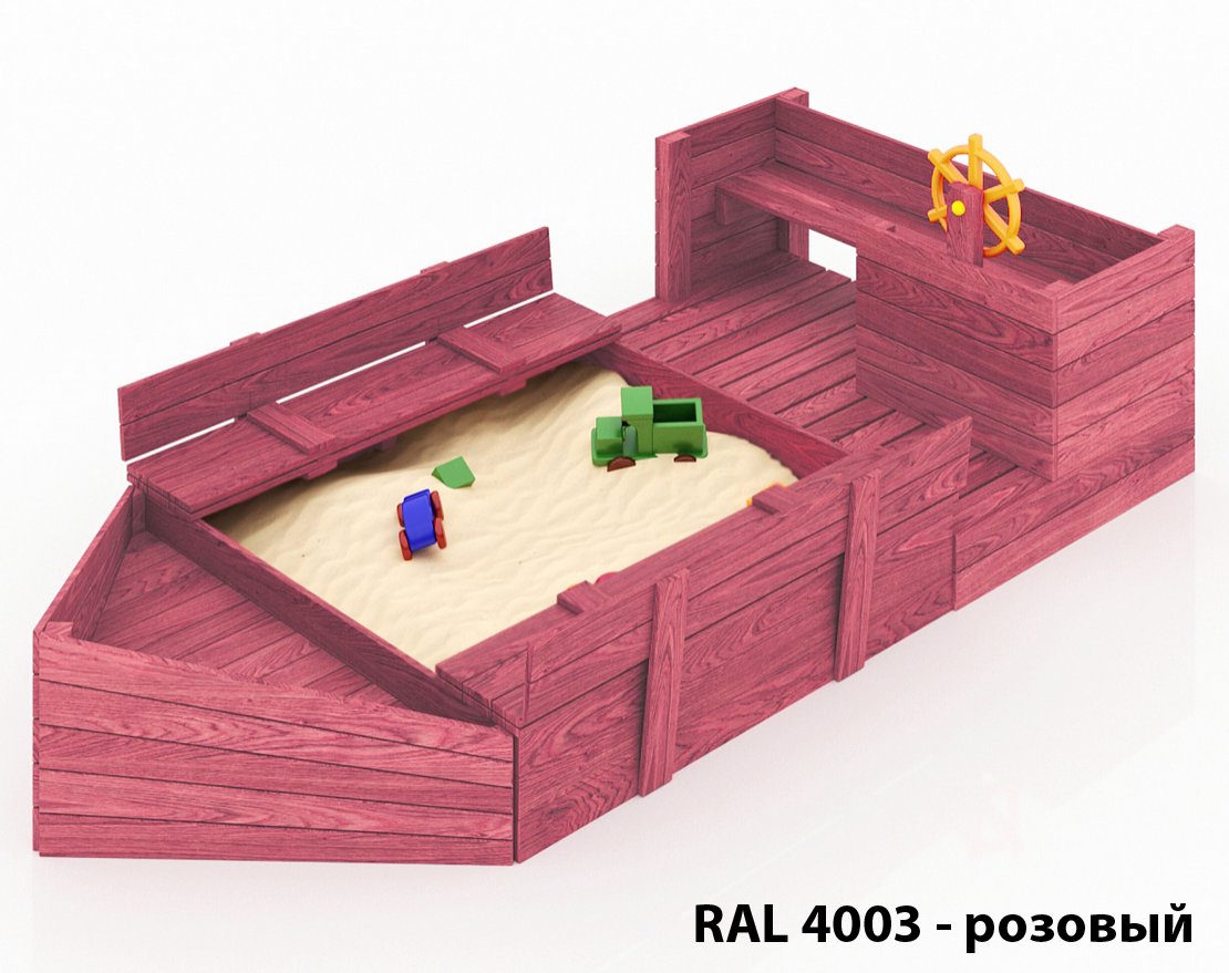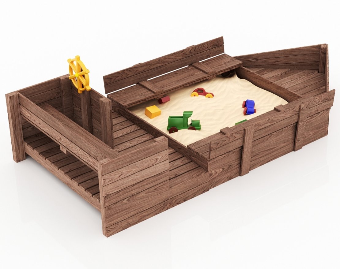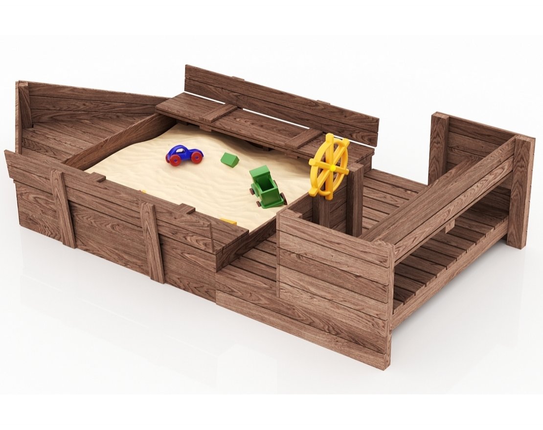 Детская песочница-кораблик и штурманская рубка со штурвалом.
