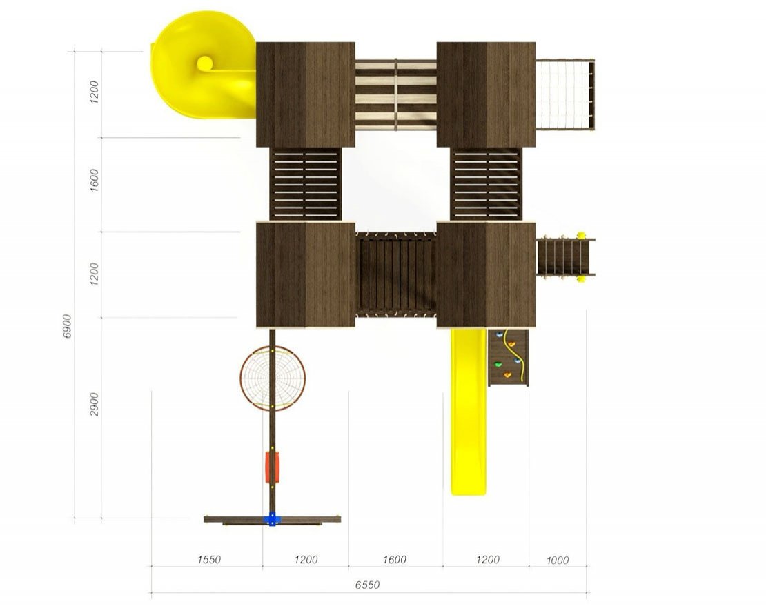 Для максимальной защиты ребёнка от травм, все углы имеют закруглённую форму, крепеж скрыт пластиковыми заглушками. Опоры изготовлены из клеёного бруса толщиной 90*90 мм.