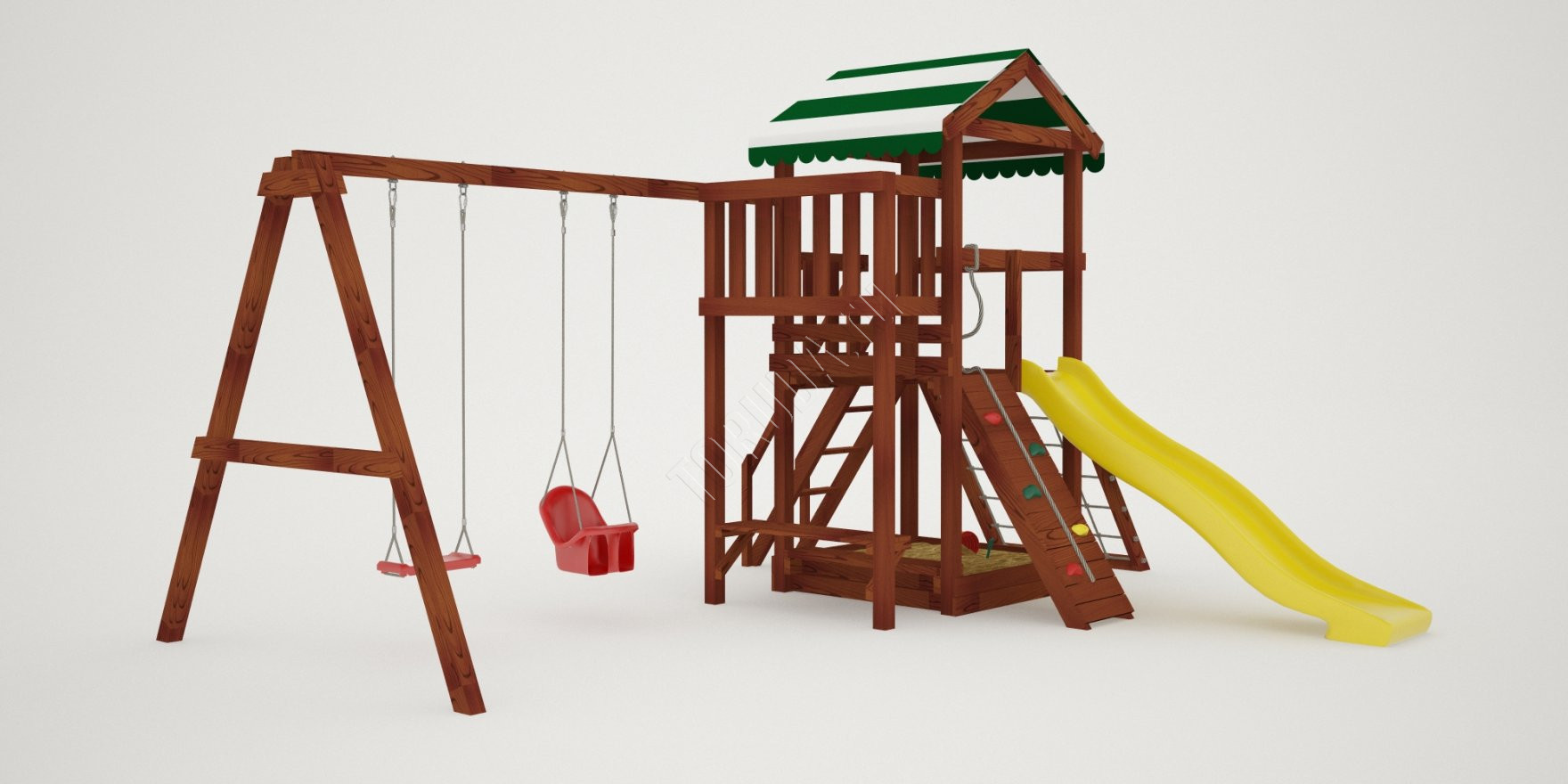 Центром площадки является игровая башня с высотой платформы 1200 мм и крышей, покрытой тканью или деревом. Забраться на башню можно несколькими способами: