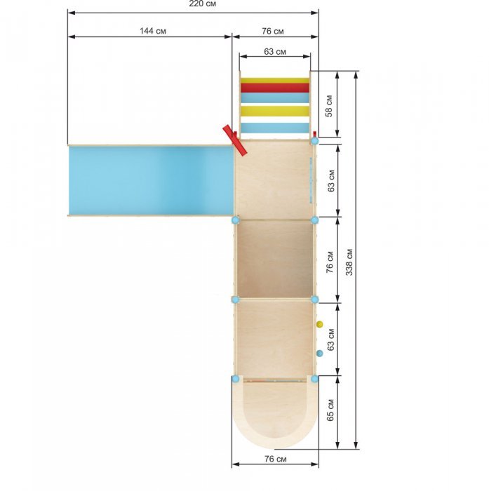 При производстве обязательно учитывалась безопасность маленьких пользователей. Сооружение имеет оптимальные габариты, удобные ручки, отсутствуют острые углы, на поверхности не торчат крепления. Фанера из берёзы толщиной 15 мм – предпочтительный материал, пропитывающийся нетоксичным маслом. Натуральный материал отличается приятной фактурой, долговечностью и экологичностью.