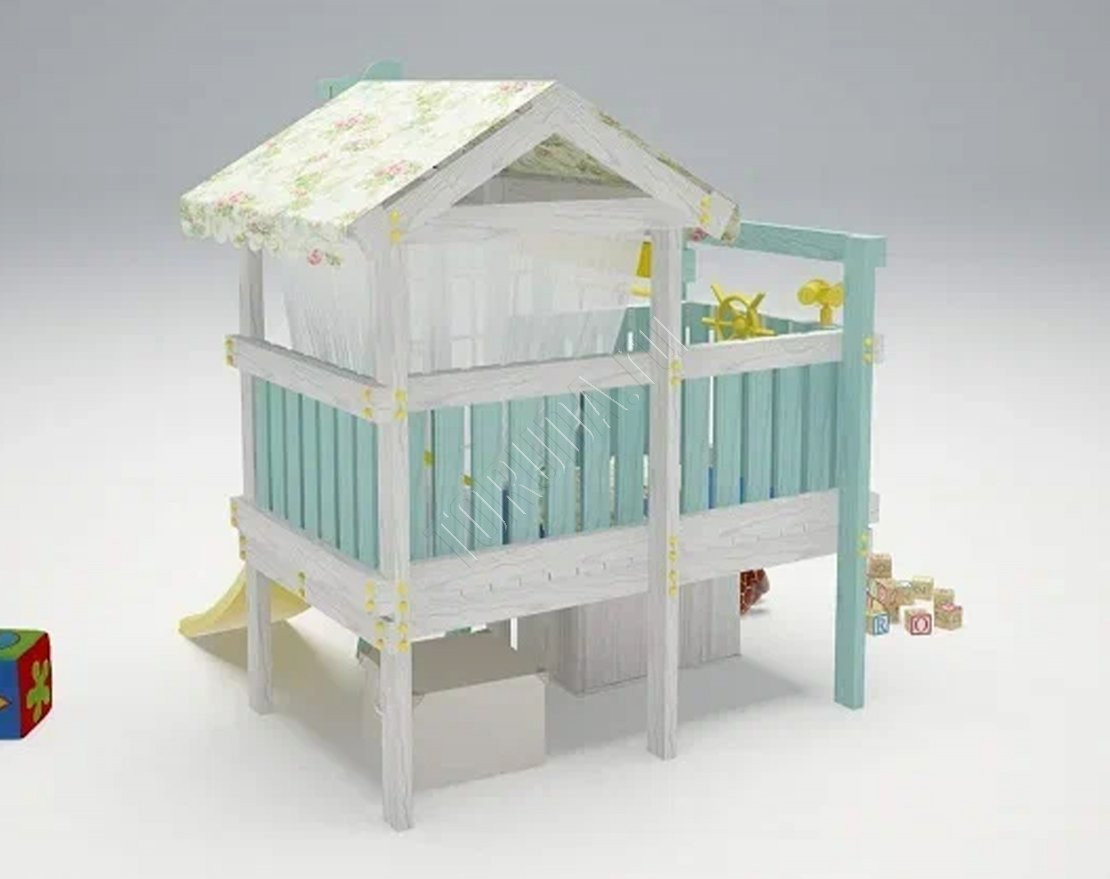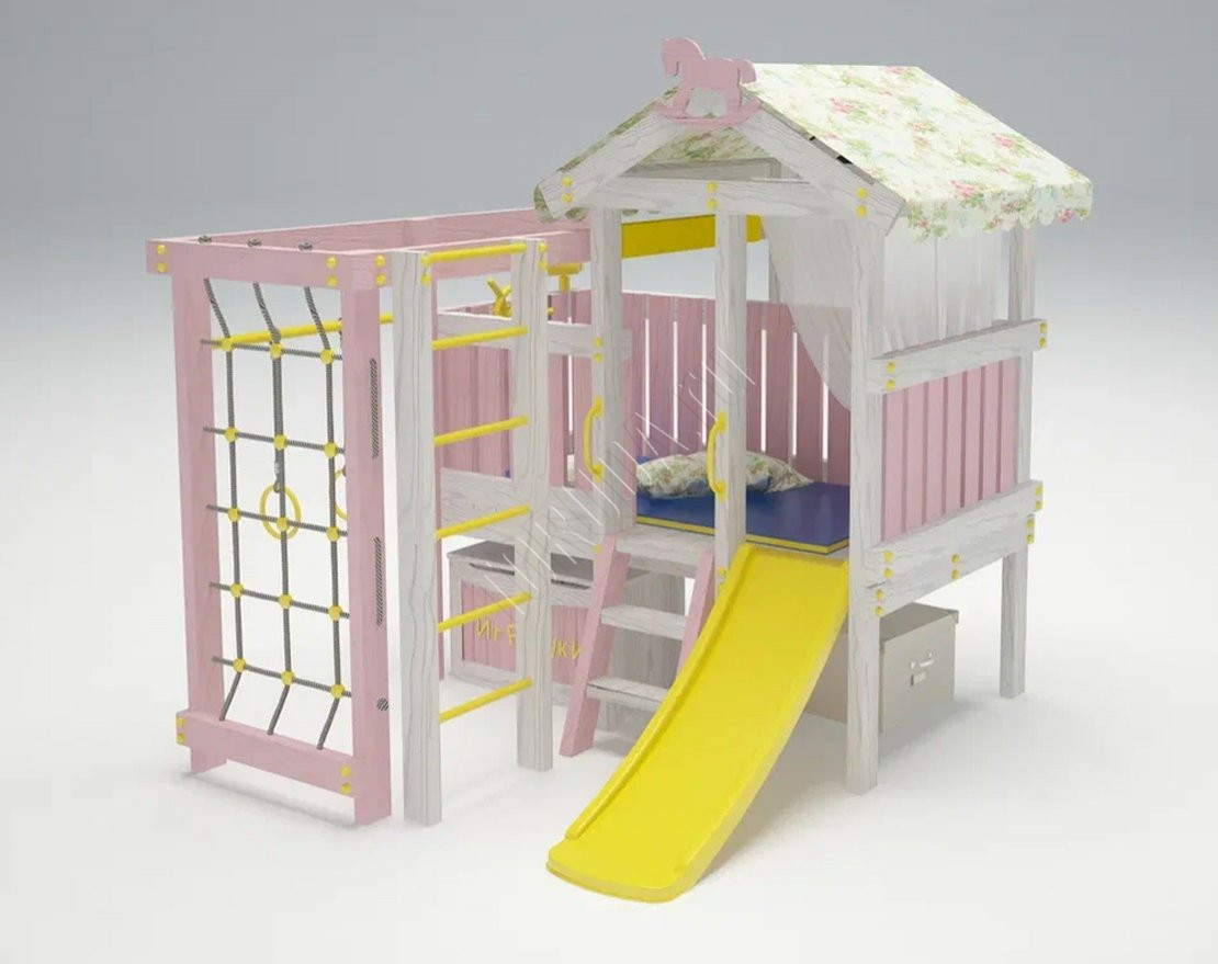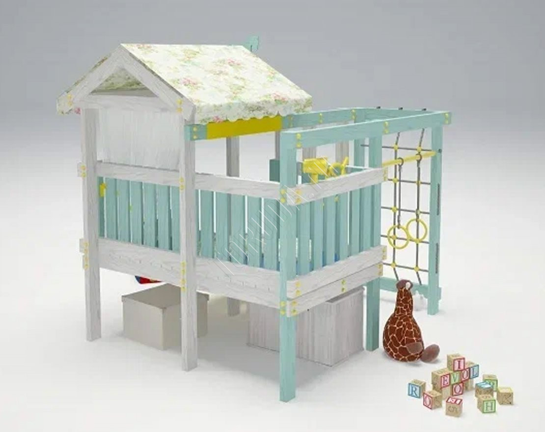 - Модель включает в себя три объединенных зоны: домик на платформе высотой 60 см, балкон и спортивный комплекс. Пространство под детской площадкой позволит хранить небольшие ящики. Ребёнок может положить туда мягкие игрушки, машинки, мячи и прочие предметы.