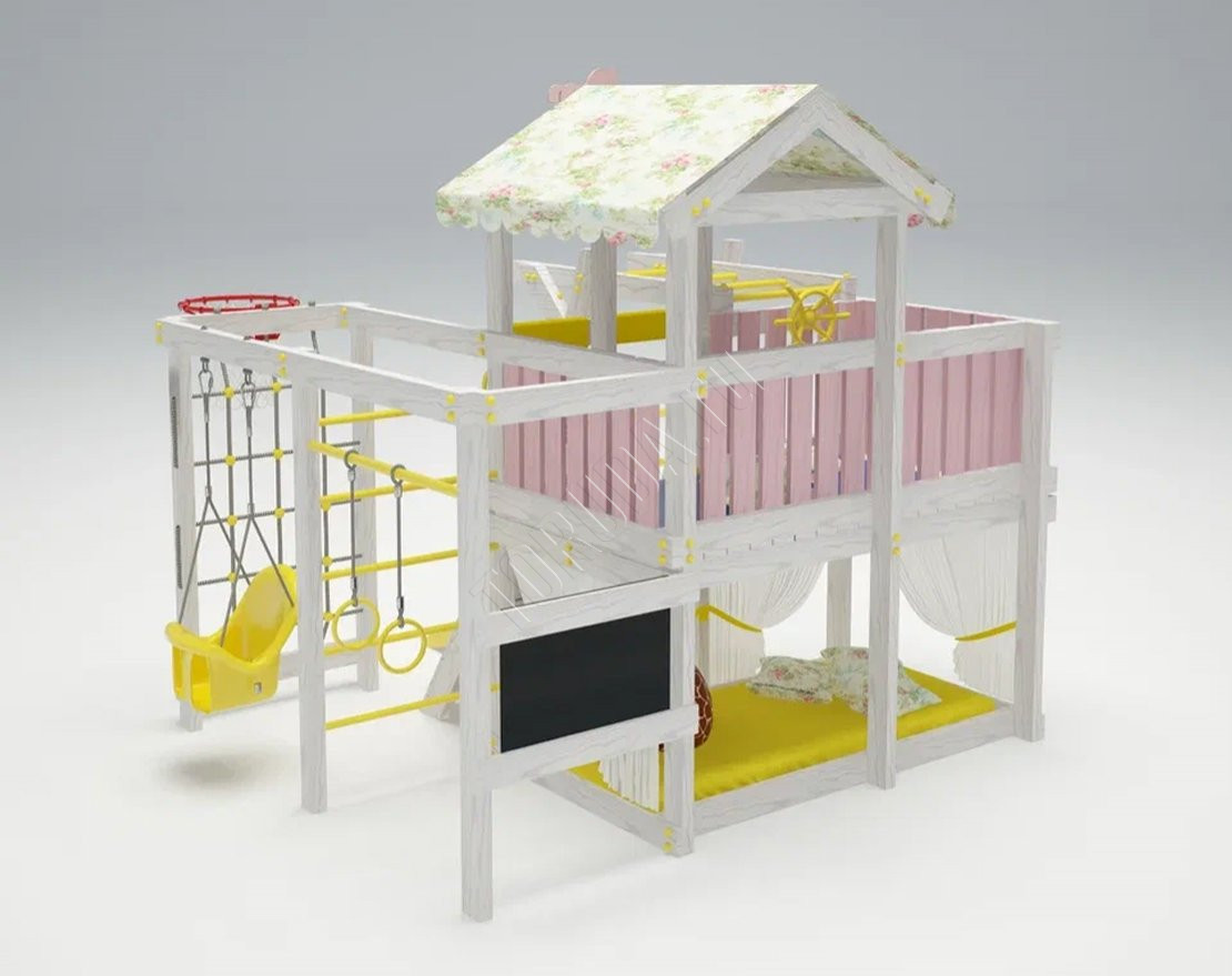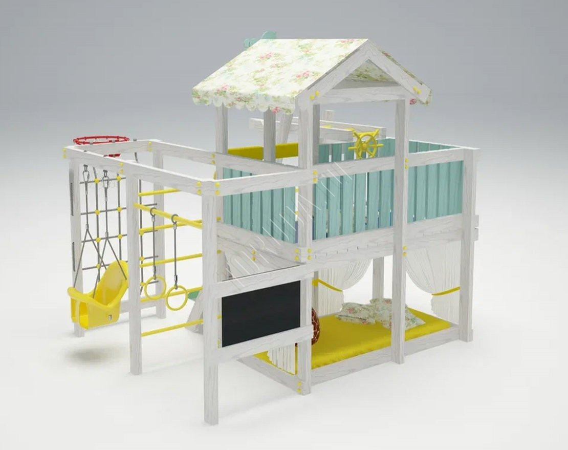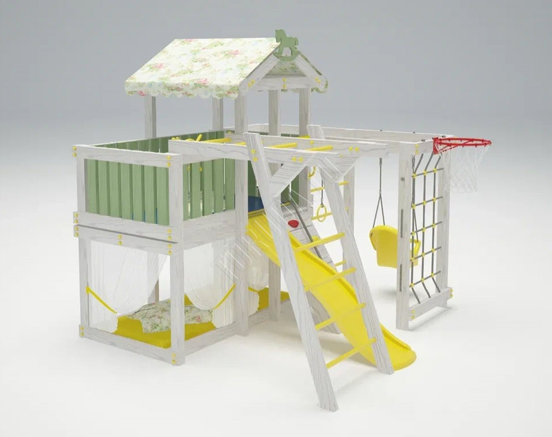 Каркас игрового комплекса изготовлен из натурального материала – массива сосны сечением 45мм х 90 мм. Всё оборудование бельгийского производства. Оно очень удобное, комфортное и безопасное для малышей.